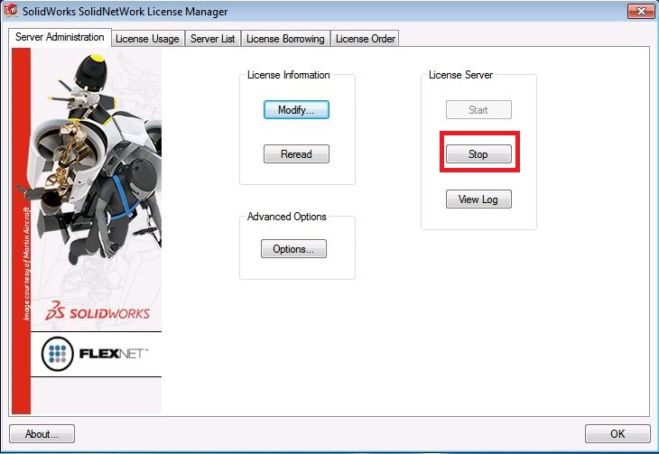 1. Ustavitev obstoječega licenčnega strežnika (SolidNetWork License Manager 2014 -> zavihek Server Administration -> License Server -> Stop)