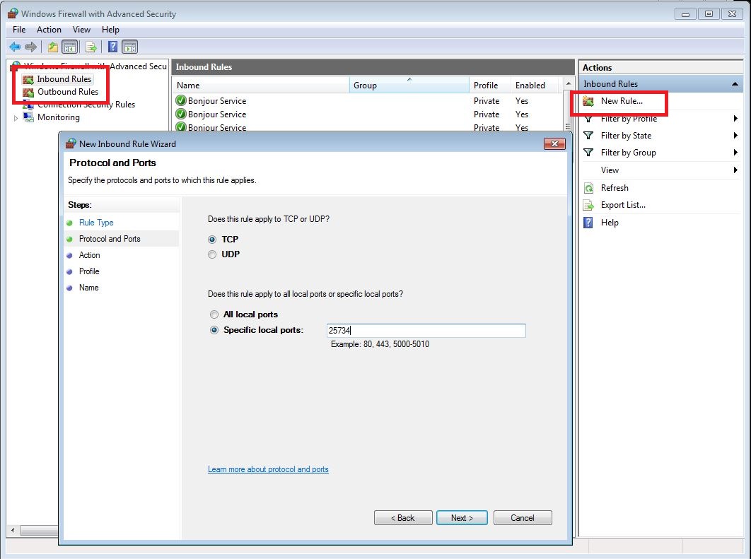 3. Pod outbound rules se doda novo pravilo: New rule -> pri vratih se vpiše številko vrat iz koraka 4.b (privzeto 25734) in 25735, v naslednjem koraku pa se mora označiti "Allow the connection".