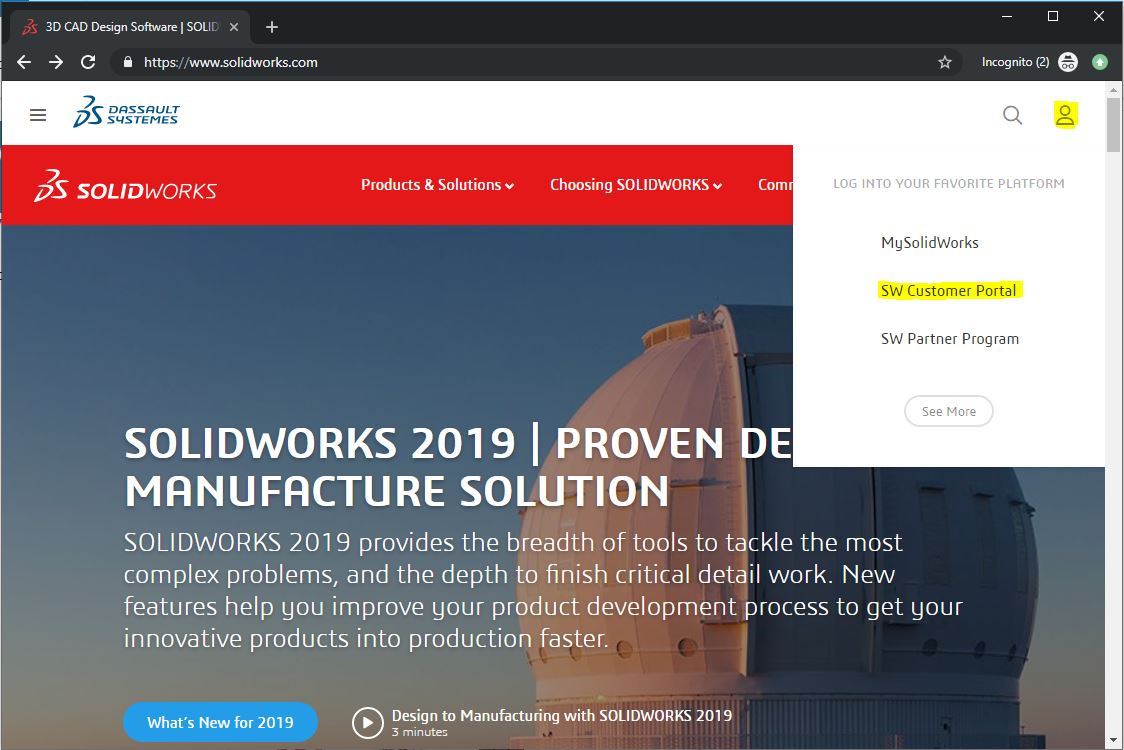 2. Kliknite na "SW Customer Portal" v levem zgornjem vogalu 3. Odpre se vam nova spletna stran "SOLIDWORKS Customer Portal"
