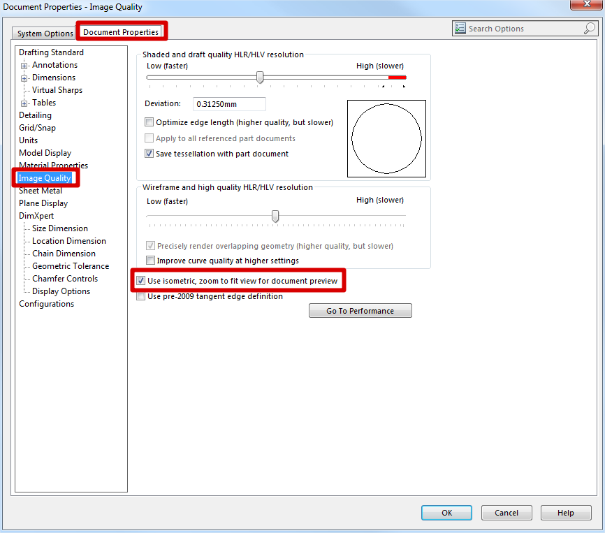 V SOLIDWORKS-u se lahko nastavi, da se predogledi shranjujejo v izometričnem pogledu. Ta nastavitev se nahaja na "Tools->Options->Document Properties->Image Quality->Use isometric, zoom to fit view for document preview".