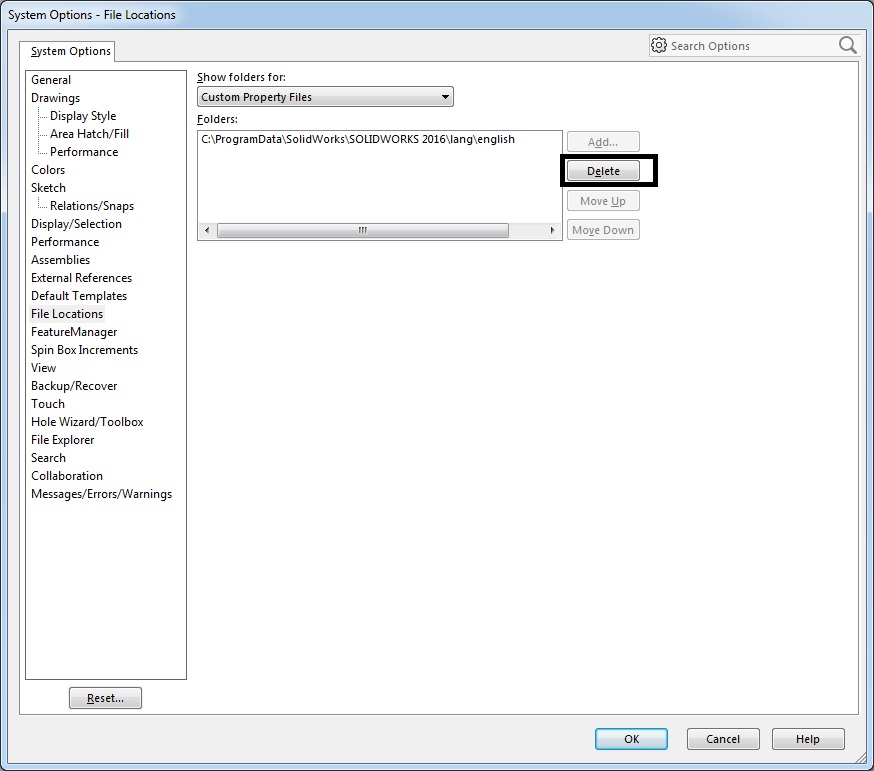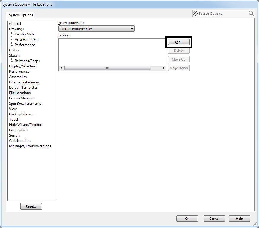 V SOLIDWORKS nastavitvah želim zamenjati pot do nove mape za Custom Property Files toda ikona Add... je neaktivna.