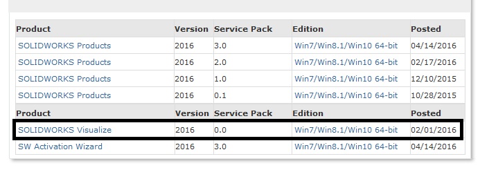 - V filtru izberite verzijo SOLIDWORKS-ovih produktov 2016 ter spodaj boste videli SOLIDWORKS Visualize: