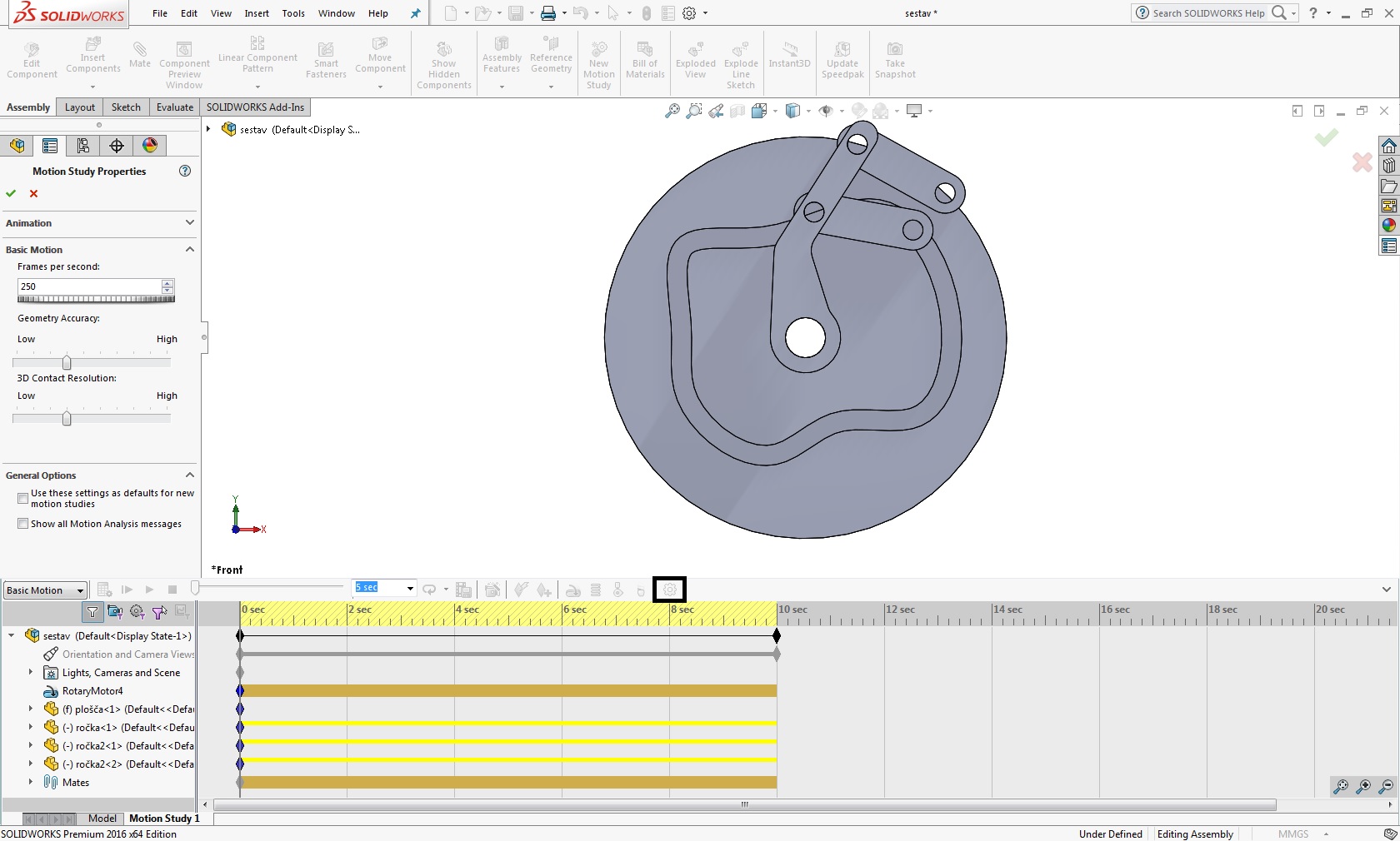 Ko imamo določene relacije vklopimo Motion Study in definiramo rotacijski motor ter izberemo površino luknje na kosu ročka.sldprt okoli katere zavrtimo.