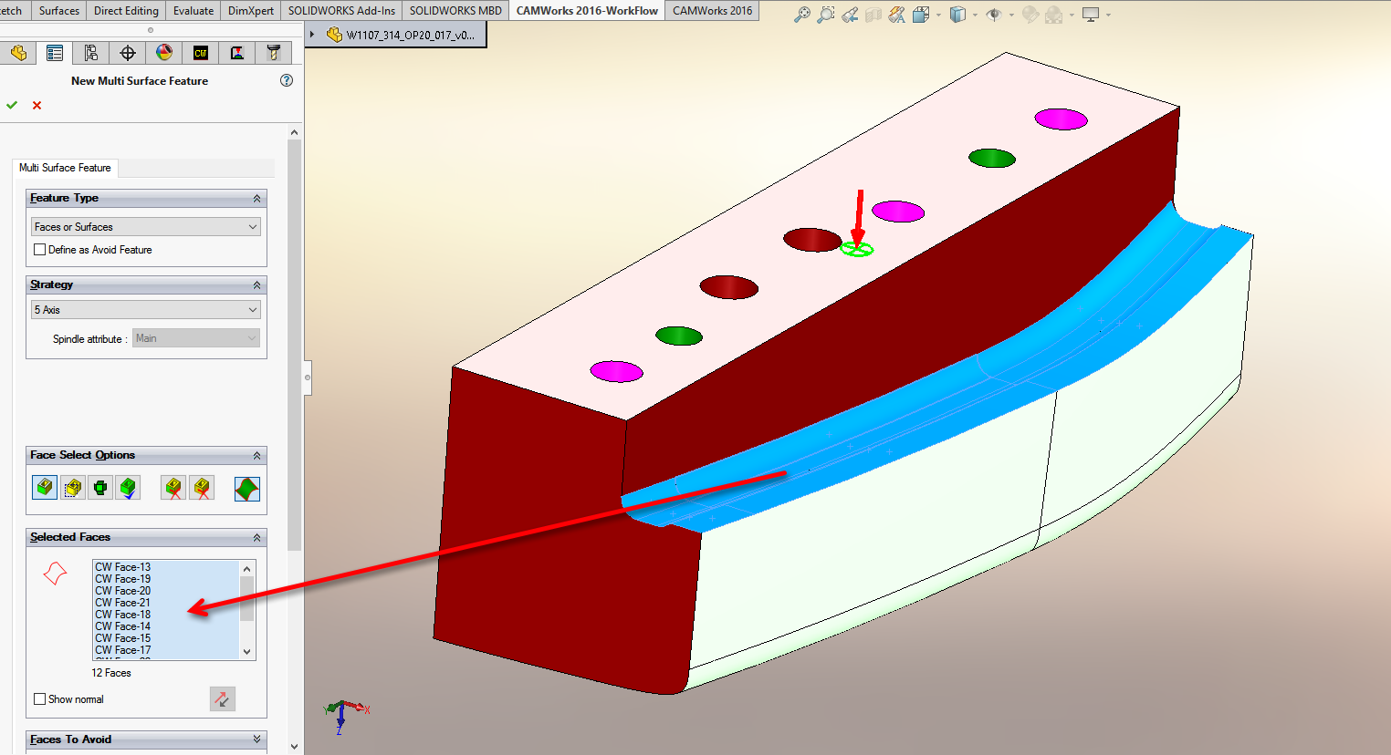 1. Dodajte gradnik s pomočjo MULTI SURFACE FEATURE (zgornjo površino bomo uporabili samo za odmik, zato jo nismo dodali med obdelovalne površine). 2. Izdelajte operacijski načrt in odprite nastavitve operacije.