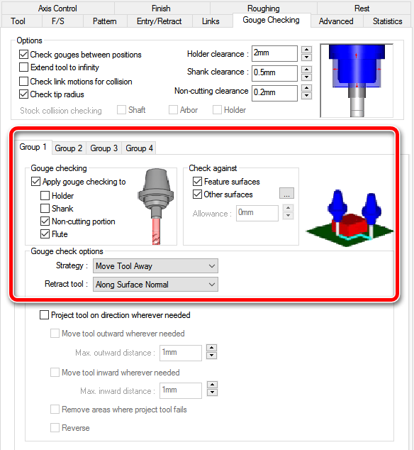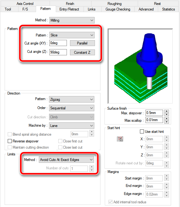3. V zavihtku PATTERN nastavite naslednje vrednosti kot so prikazane na spodnji sliki. 4. Kliknite na zavihek AXIS CONTROL in določite CONTACT POINT = AT CENTER. 5. Kliknite na zavihek GOUGE CHECKING (tukaj bomo nastavili 2 področja odmika)