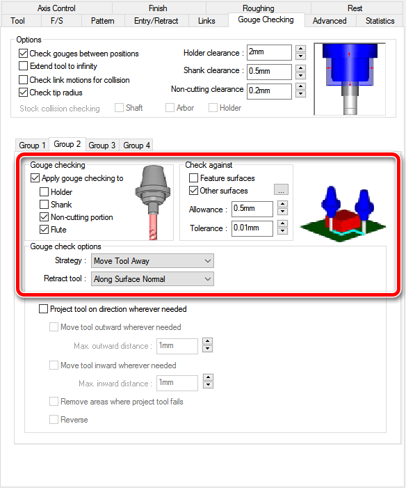 a. Nastavite vrednosti kot jih prikazuje spodnja slika b. Kliknite na gumb … in izberite naslednje površine, ki določajo odmik orodja od površine