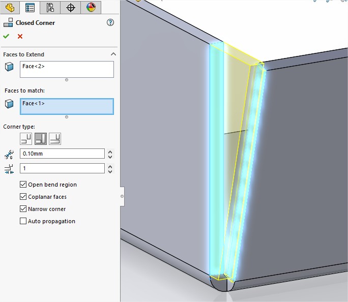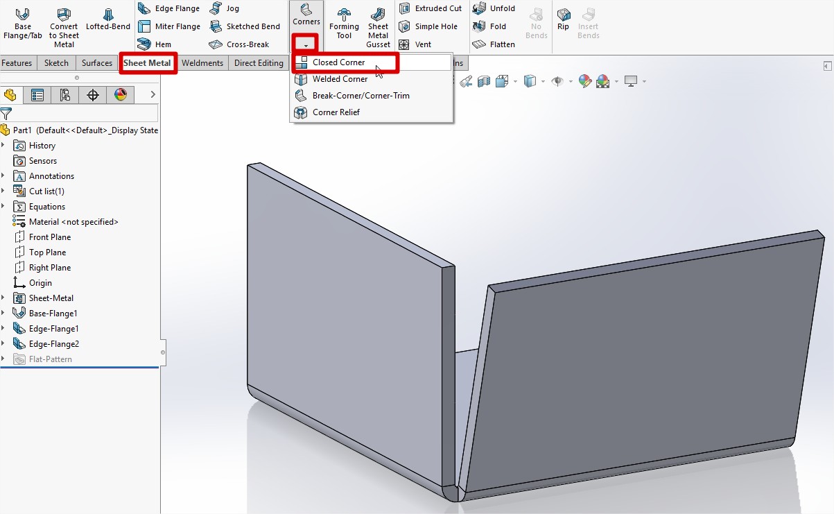 Če želimo zapreti špranjo med zavihki, lahko uporabimo funkcijo Closed Corner. Ta funkcija se nahaja na zavihku »Sheet Metal« pod ukazom »Corners« ali na »Insert« -> »Sheet Metal« -> »Closed Corner«.