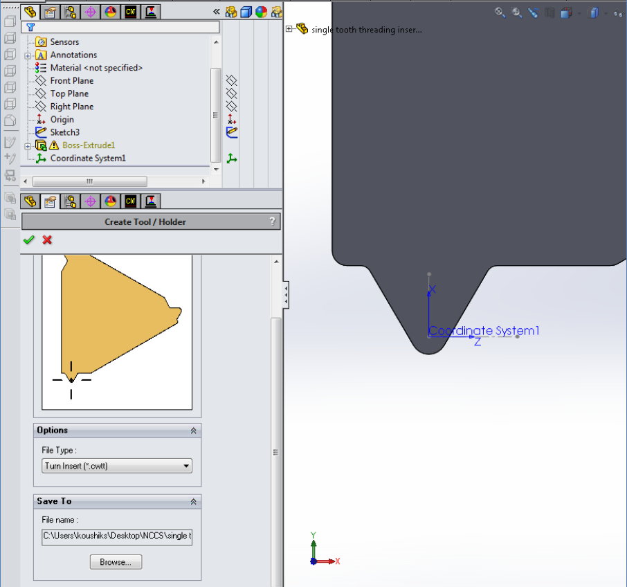 2. Izdelajte model z debelno ploščice in v CAMWorks meniju kliknite na CAMWorks user defined too/holder (V oknu Create tool / Holder morate videti predogled kot je na sliki spodaj).