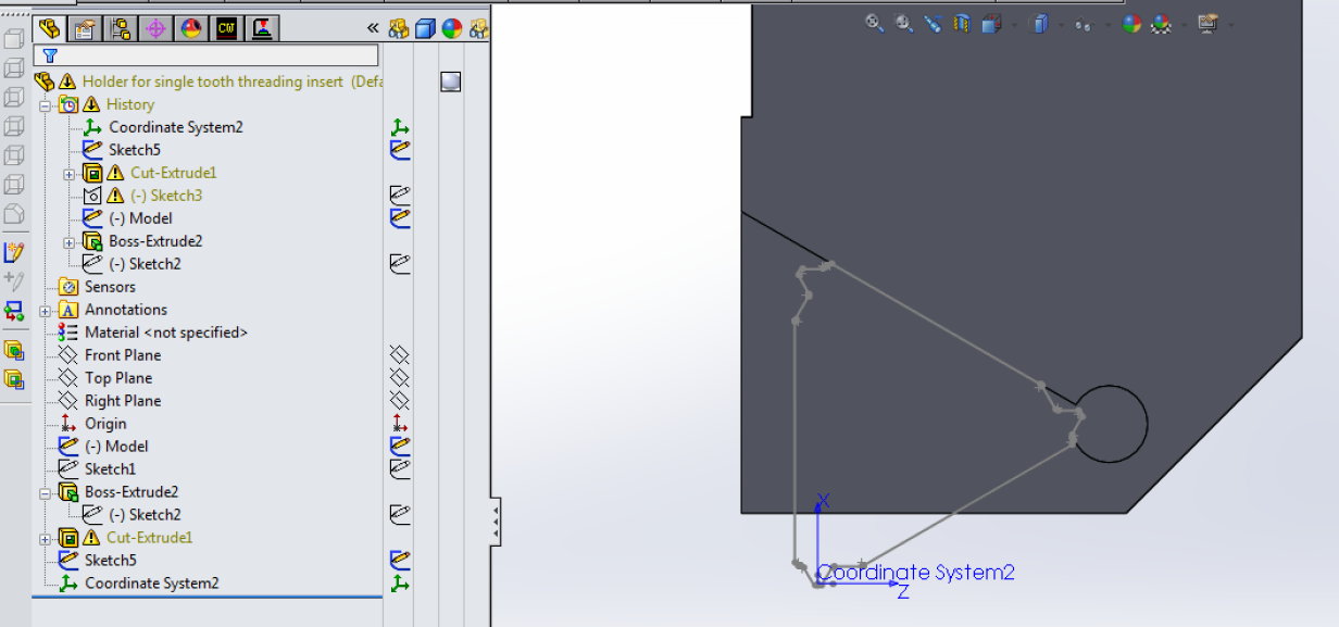 1. Narišite skico - pogoj je, da je radius noža postavljen v SOLIDWORKS-ov nulti koordinatni sistem (rdeč koordinatni sistem - slika).