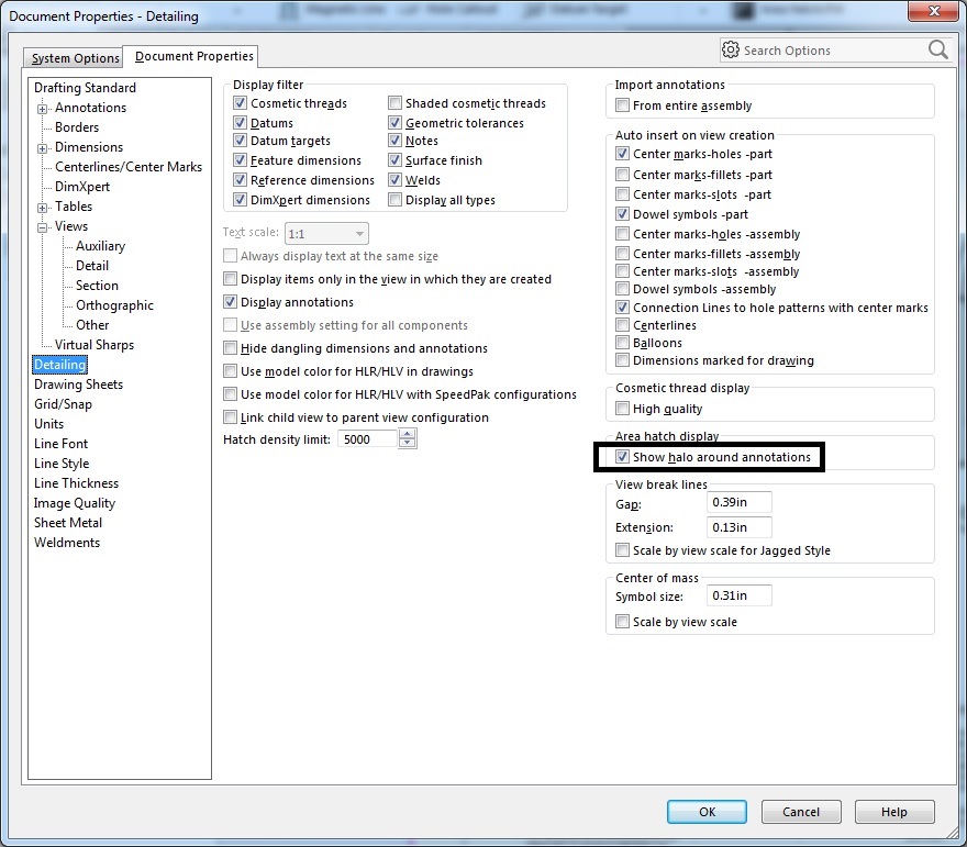 Da se odtrani šrafura okoli dimenzije na risbi je potrebno imeti vključeno funkcijo "Show halo around annotations", ki se nahaja v SOLIDWORKS nastavitvah pod Tools->Options->Document Properties->Detailing->Are Hatch Display