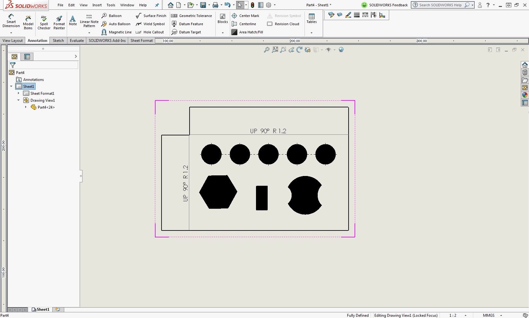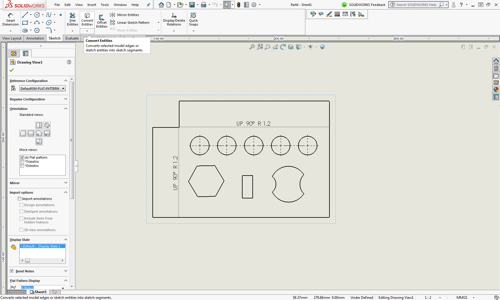 - Izberemo pogled (kliknemo znotraj obrobe pogleda in ne na kos) in kliknemo "Convert Entities" - Ko se nam prikažejo "Convert Entities" opcije izberemo površino kosa pod "Entities to Convert" in odkljukamo "Inner loops one by one" opcijo ter kliknemo na "Select all inner loops" - Ko imamo narejene konture čez robove našega modela lahko uporabimo funkcijo "Area Hatch/Fill"