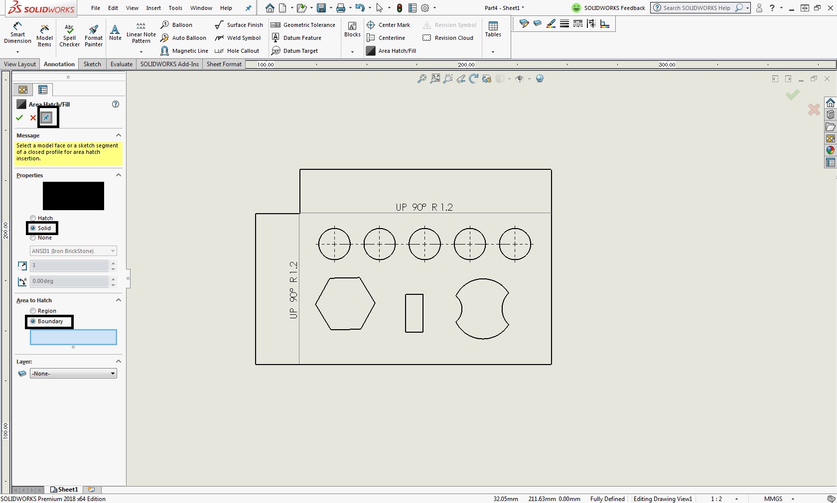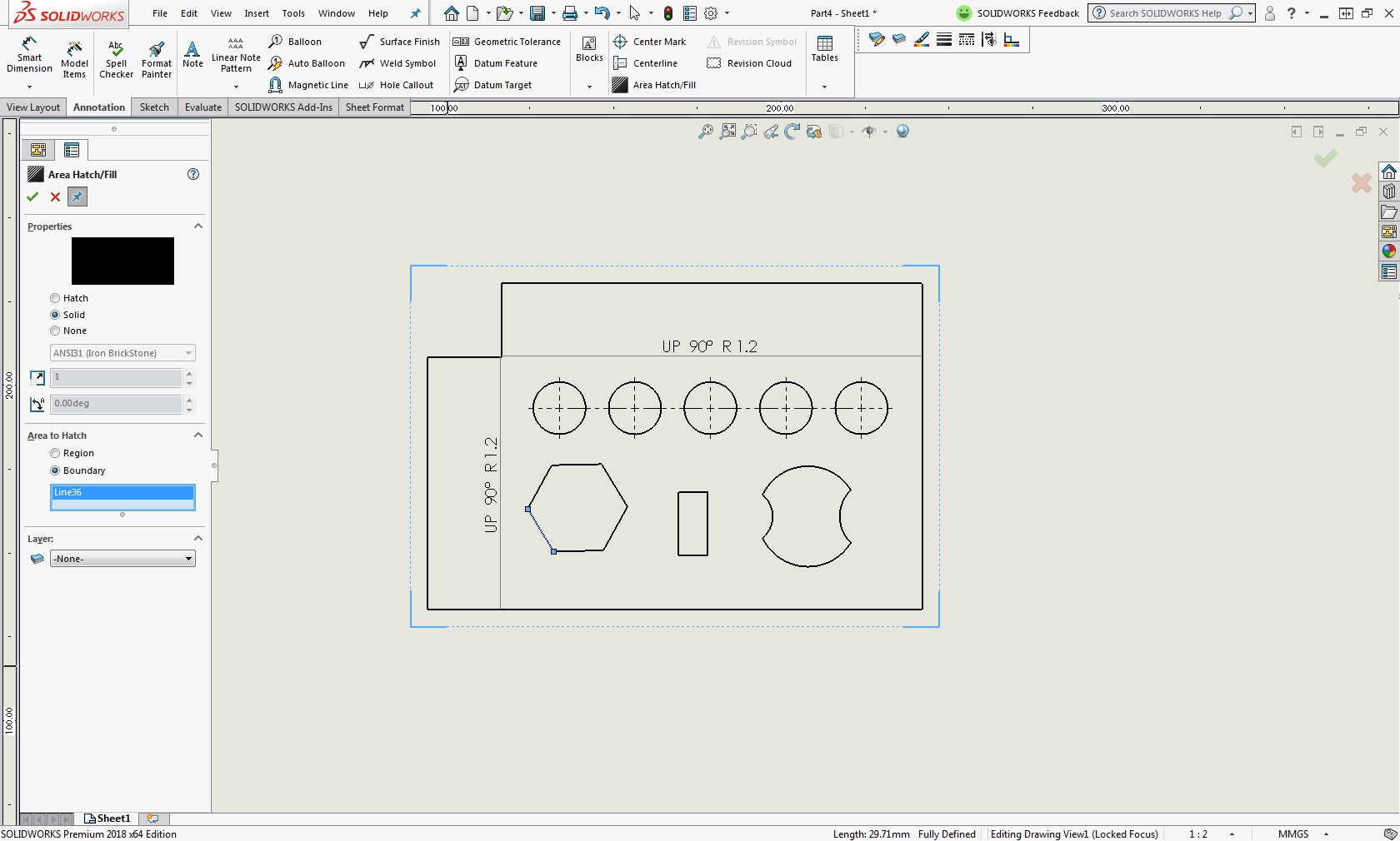 - Ker gre za polno barvo pod Properties v Solid za "Area to Hatch" Boundary. Ker imamo več lukenj za pobarvat lahko tudi pripnemo "žebljiček" - Da pobarvamo odprtine kliknemo na dodane konture z "Convert Entities" in potrdimo funkcijo "Area Hatch/Fill" - Postopek ponovimo za preostale odprtine