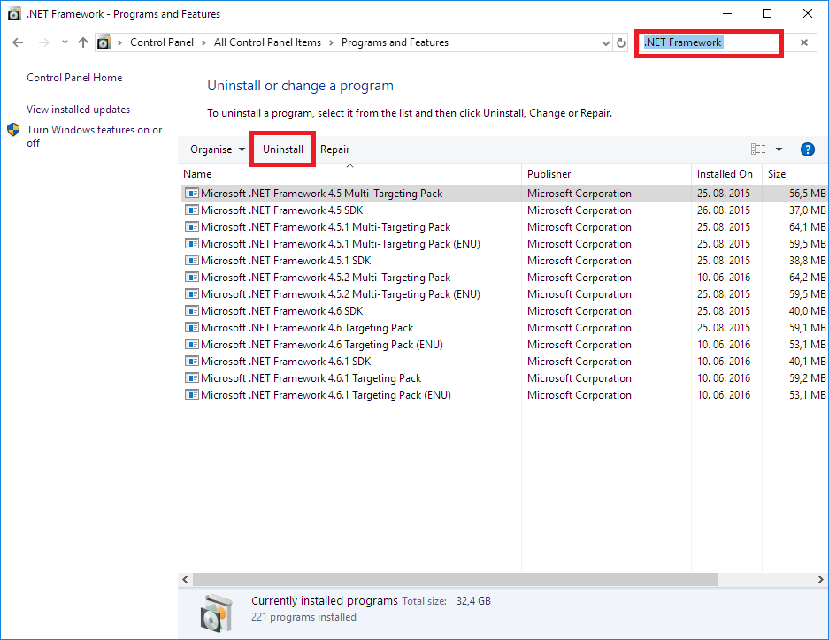1. V Nadzorni plošči odpremo okno Programi in funkcije in polje za iskanje vpišemo ".NET Framework". 2. Vse najdene komponente odstranimo tako, da na vsako posebej kliknemo in nato izberemo možnost Odstrani (Uninstall).