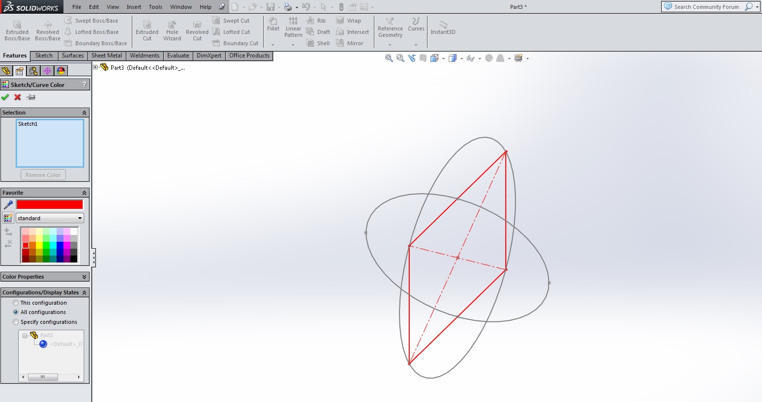 V drevesni strukturi izberimo željeno konturo in iz menija izberimo Sketch Color. Odpre se nam paleta barv kjer izberemo eno izmed barv in potrdimo. S tem je spremenjena barva trenutne konture v trenutnem dokumentu.