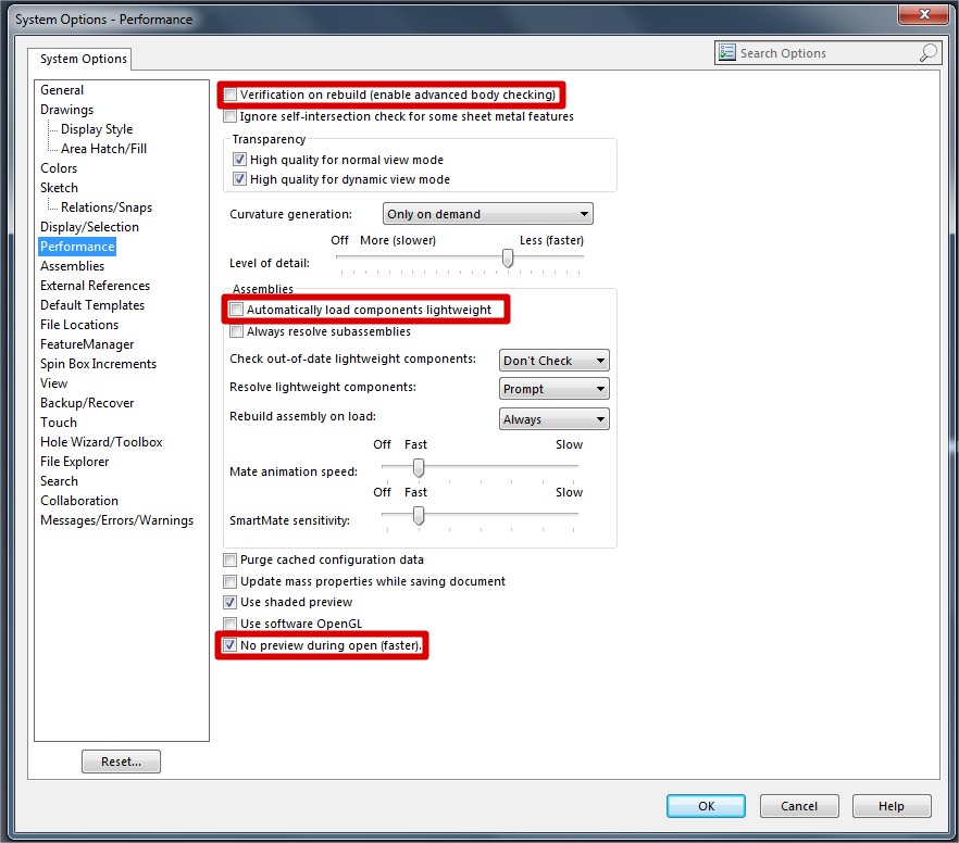 Za nastavitve, ki vplivajo na hitrost delovanja, je potrebno izbrati "Tools->Options->System Options->Performance". Tukaj so tri nastavitve, ki pospešijo odpiranje sestavov v SOLIDWORKS-u. Te nastavitve so: