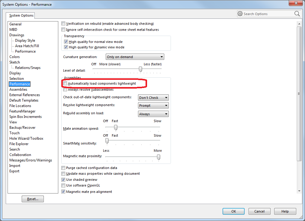 Ko odpiram sestav v SOLIDWORKS neglede na število komponent se sestav vedno odpre v Lightweight načinu.
