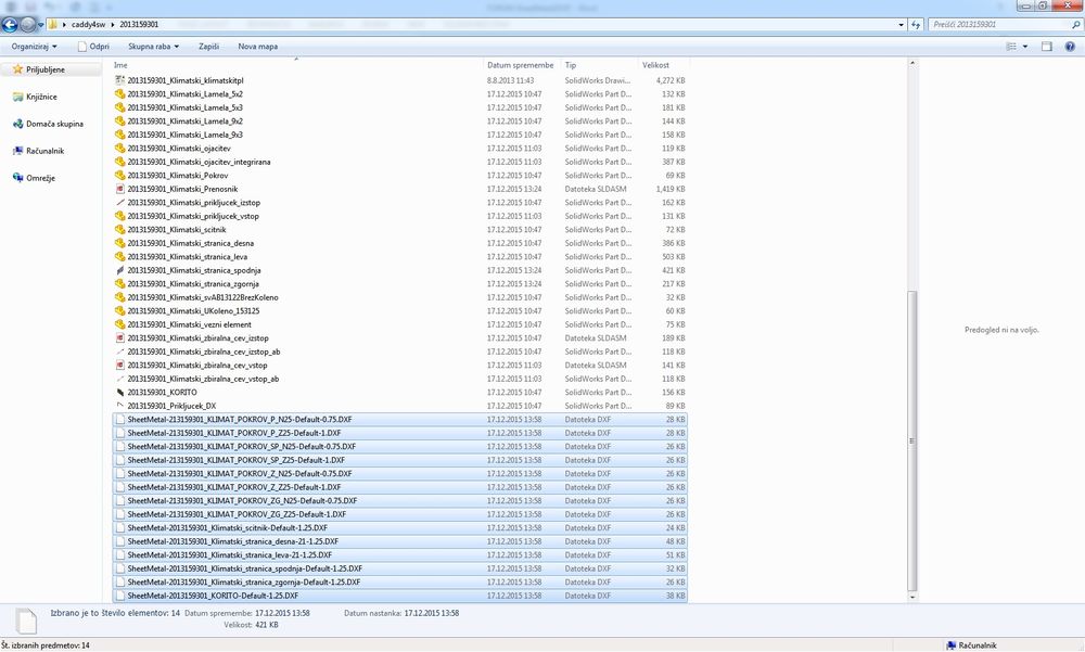 - Sedaj imamo ustvarjene DXF datoteke razvitih pločevin v isti mapi v kateri imamo shranjen glavni sestav. V našem primeru je to 14 DXF datotek.
