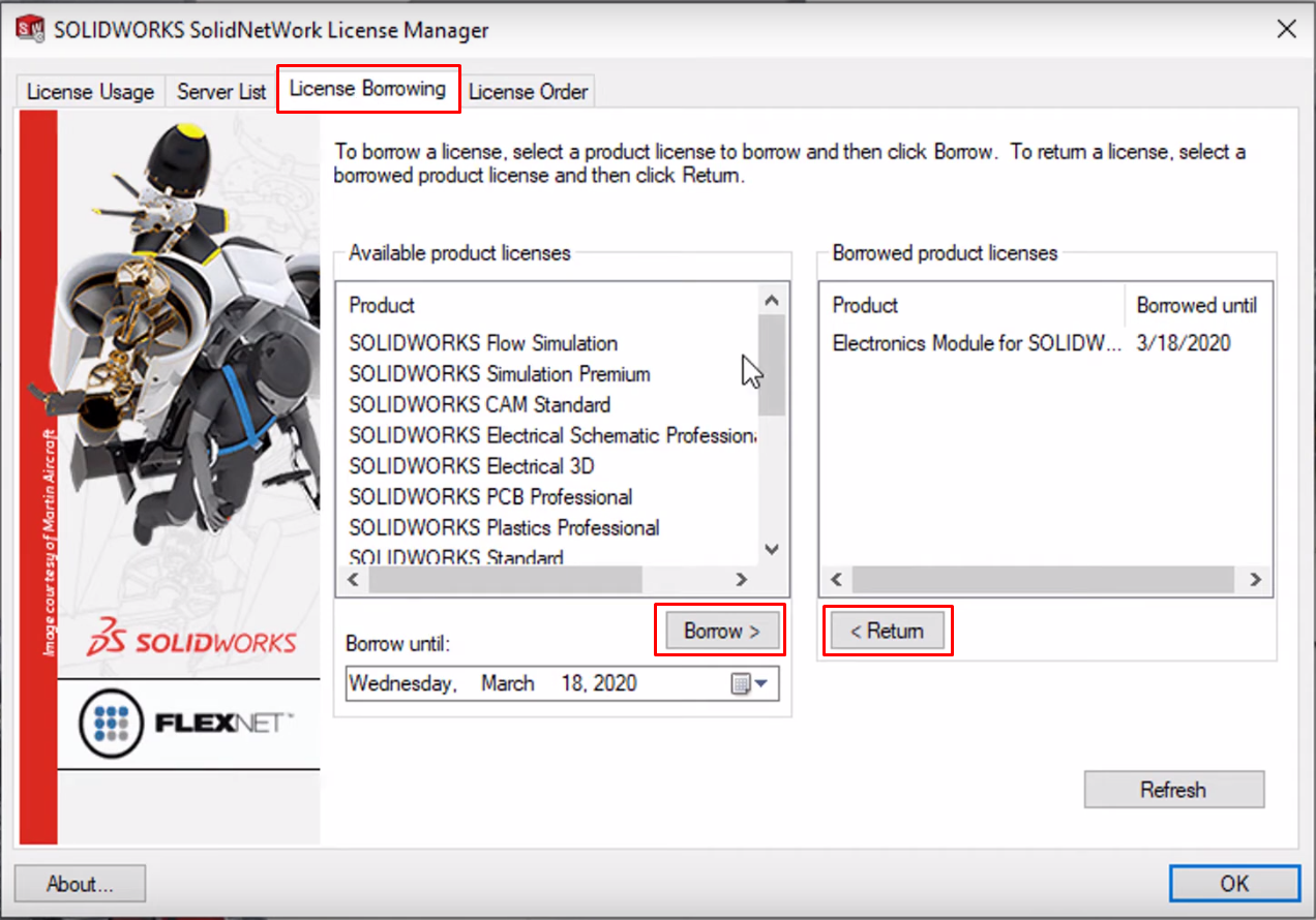 Odpre se aplikacija, kjer na vrhu izberemo zavihek »License Borrowing«. Na tem zavihku lahko vidimo katere licence so na voljo in si jih s klikom na gumb »Borrow« lahko izposodimo. Določiti moramo čas izposoje (najdaljši čas izposoje je 30 dni). Licenca se po določenem času samodejno vrne. Če se v pisarno vrnemo prej kot smo pričakovali, pa lahko licenco ročno vrnemo tudi z »Return« gumbom.