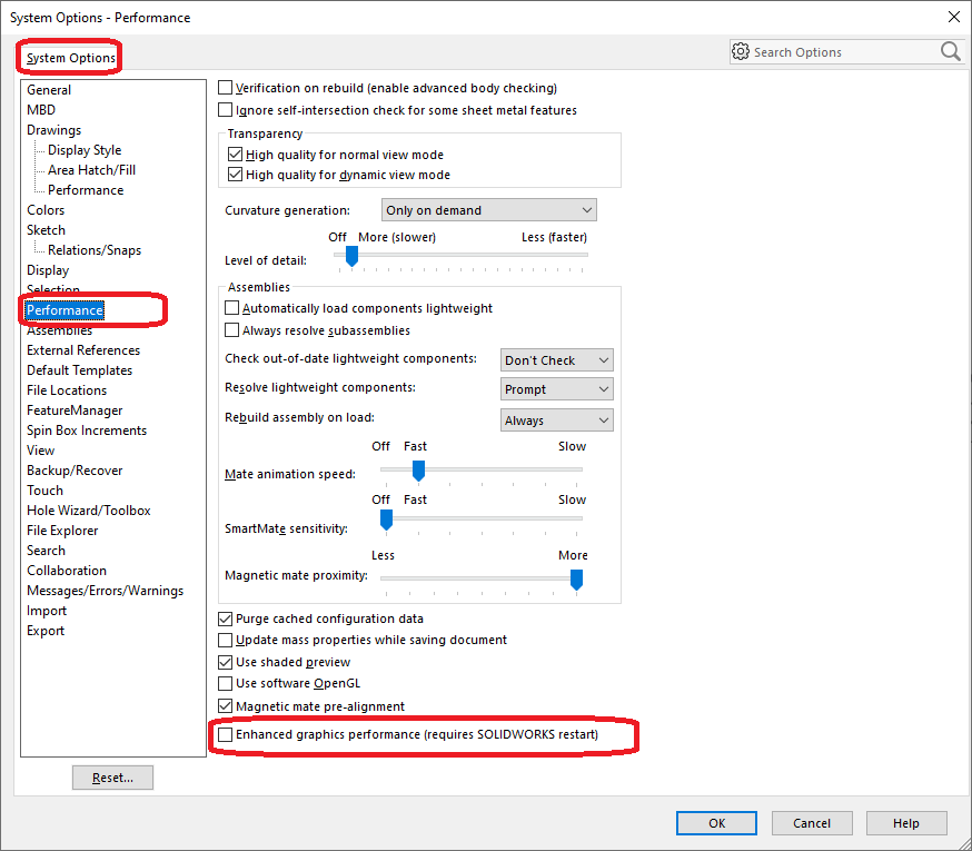 Najprej bi vas predlagali da izklopite ocijo “Enhanced graphics performance (requires SOLIDWORKS restart)” ki se nahaja pod Tools->Options->System Options->Performance. Po izklopitev te opcije, ponovno zaženete SOLIDWORKS.