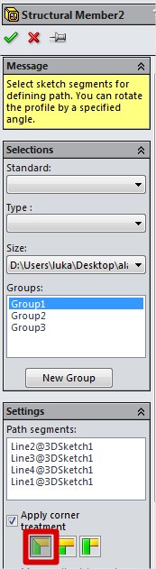 To se naredi tako, da se najprej naredi vse tri varjence (tukaj bodo v dveh ali treh skupinah). Vsi trije varjenci morajo biti v istem gradniku ("Structural Member"). Uporabimo "Edit feature" gradnika. V nastavitvah funkcije izberemo "End Miter" in nato kliknemo na rob, ki ga želimo spremeniti.