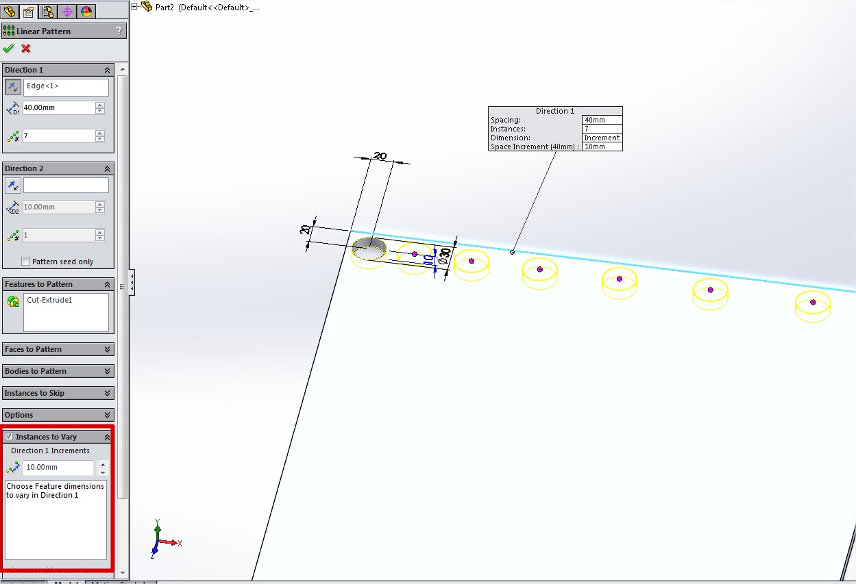 Linear pattern vsebuje možnost spreminjanja razdalj med elementi. To se lahko spreminja v predelu "Instances to Vary", kjer lahko določimo korak, s katerim bo razdalja med elementi naraščala oz. padala.