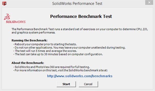 SOLIDWORKS že nekaj let vsebuje aplikacijo za testiranje sistema. Ta aplikacija se imenuje "SOLIDWORKS Performance Test". Aplikacija se nahaja na Start meniju pod "SOLIDWORKS <verzija>/SOLIDWORKS Tools".