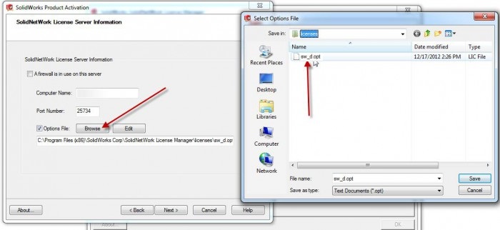 V novo kreirano datoteko vpišemo opcije, katere potrebujemo. Sintakse za vpis različnih opcij se razlikujejo, a so si podobne. Vse opcije, ki so na voljo, vključno z vsemi pripadajočimi sintaksami in opisi, najdete v dokumentu, ki je na voljo po namestitvi SOLIDWORKS licenčnega strežnika. Običajno je ta na voljo v naslednji mapi:
