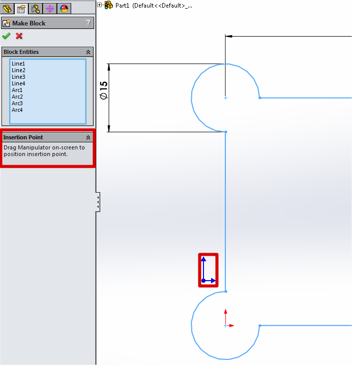 Odprla se bo ukazna vrstica, ki bo prikazala elemente v bloku. Če v ukazu izberemo "Insertion point", se bo v delovnem oknu prikazala modra ikona, ki označuje kje bo imel blok začetno točko. Modro ikono za točko "Insertion point" lahko premikamo po delovni površini.