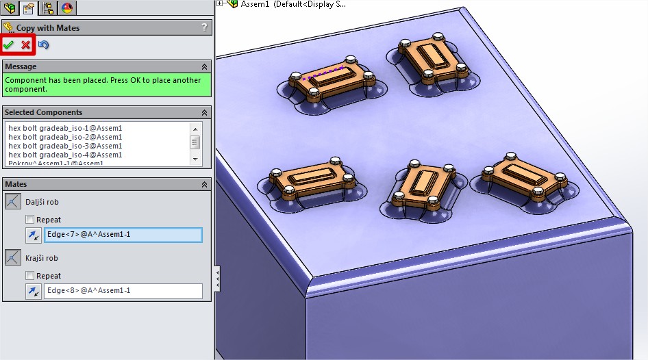 V sestavu imam geometrijo v katero je potrebno večkrat vstaviti isto skupino kosov na enak način (pokrov z vijaki npr.). Pattern v tem primeru ne pride v poštev. Je še kakšna dodatna možnost za dodajanje teh kosov?