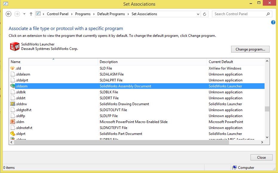 Od SOLIDWORKS verzije 2013 naprej, za odpiranje datotek skrbi drug program imenovan SOLIDWORKS Launcher. Vzrok za zgornjo težavo je ta, da je kot privzeti program za odpiranje datotek .sldprt, .sldasm in .slddrw najverjetneje izbran kar program SOLIDWORKS 2014 (ali 2013, odvisno od verzije, katero imate). Težava se lahko odpravi na dva načina: