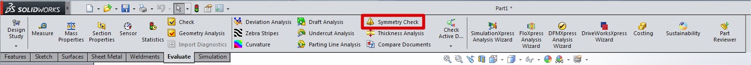 Za preverjanje simetričnosti lahko uporabimo orodje "Symmetry Check". To orodje se nahaja na zavihku "Evaluate".