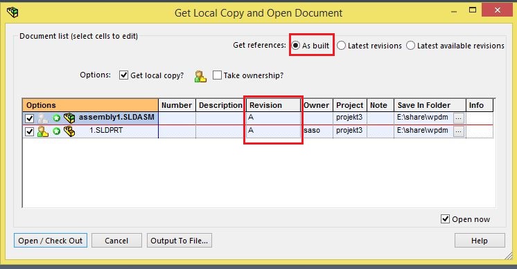 Če želimo, da se sestav odpre s tistimi revizijami podsestavov oz. kosov (referencami) s katerimi je bil sestav vnešen v zalogovnik, je potrebno ob odpiranju v oknu za izbiro revizij pri »Get references« obkljukati tudi »As built«. Poglejmo si na enostavnem primeru: