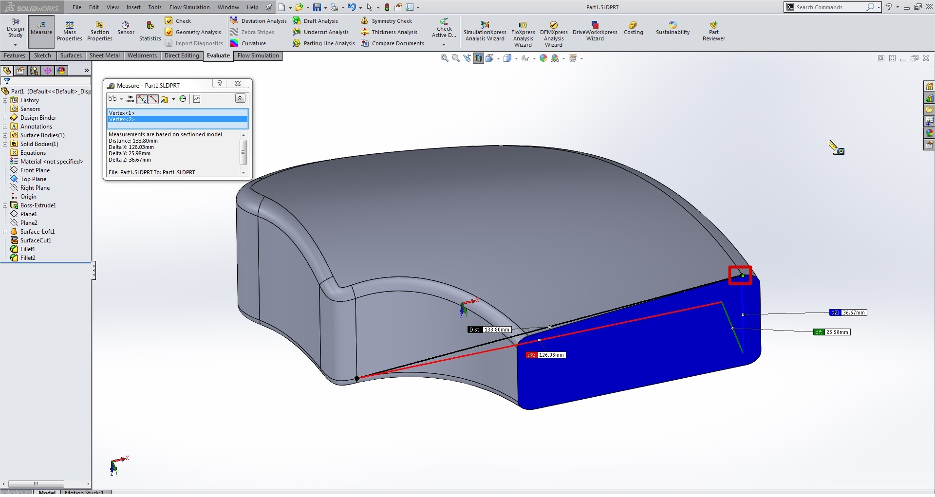 -V eDrawings se med merjenjem še vedno lahko izbira robove površine in točke, ne moremo pa izbrati točk, ki so presečišča med prerezno ravnino in robom.