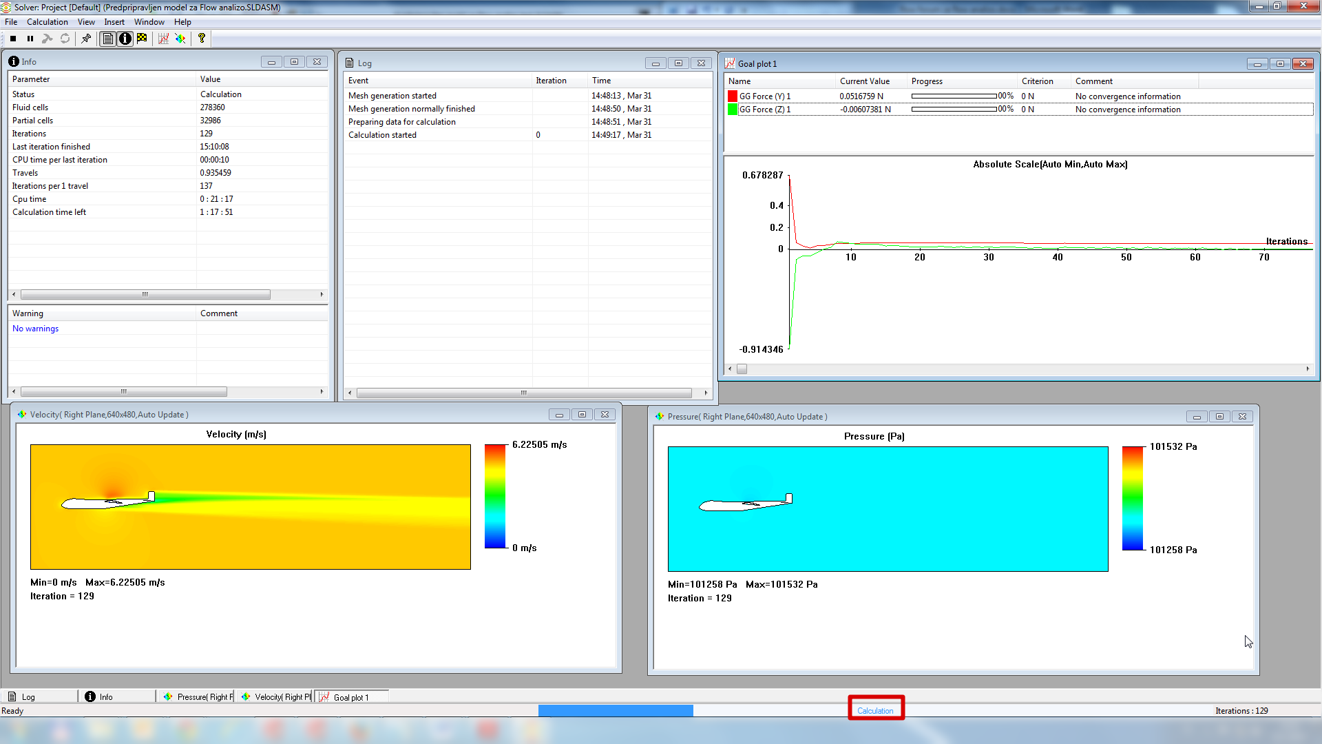 Ko se zažene analiza, se odpre okno preračuna. Analiza se bo izvajala, dokler rezultati ne konvergirajo. Ko se Analiza konča, se bo na spodnji strani okna izpisalo »Solver is finished«.