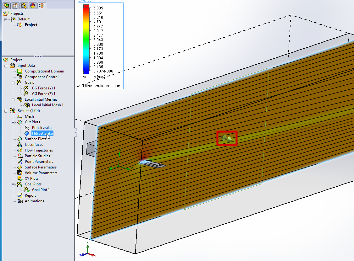 V drevesni strukturi se sedaj naložijo rezultati (poleg »Results« sedaj ne piše več »Not loaded«). Če se rezultati niso naložili, se z desnim klikom klikne na »Results« in izbere »Load«. Predpripravljena imamo dva rezultatna pogleda – »Hitrost zraka« in »Pritisk zraka«. Oba pogleda sta skrita pod »Cut Plots«. Rezultat se pokaže tako, da se z desnim gumbom klikne nanj in se izbere »Show«. Ko je pogled naložen, lahko z levim gumbom izberete pogled (v drevesni strukturi), kar v grafičnem polju prikaže puščico. S premikanjem puščice se lahko prerezni pogled premika.