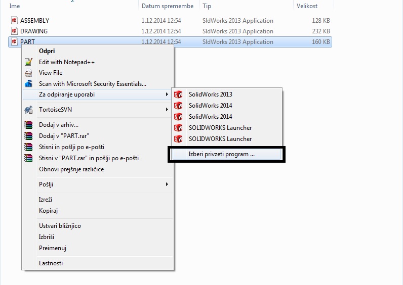 - V Windows raziskovalcu kliknemo na SOLIDWORKS datoteko desni klik in iz menija izberemo »Izberi privzeti program ...« za Part datoteko v našem primeru.
