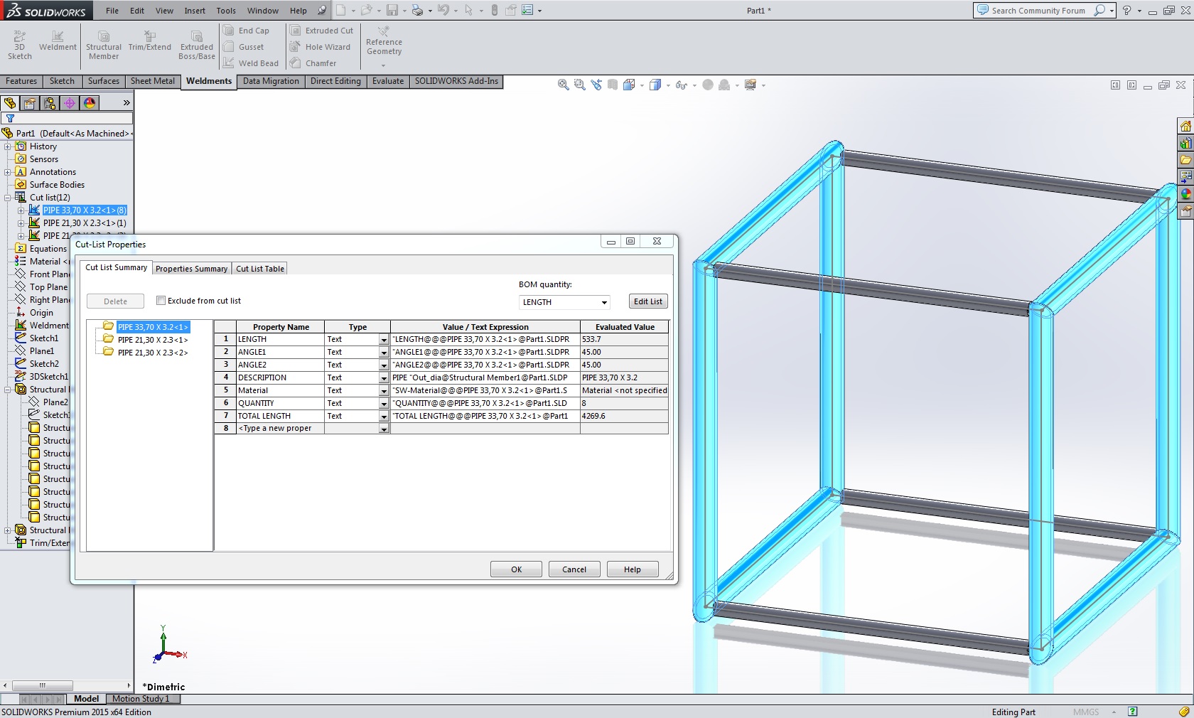 SOLIDWORKS 2015 sedaj omogoča prikaz celotne dolžine profilov varjene konstrukcije. Novi parameter se imenuje TOTAL LENGHT in je prikazan v razreni listi (Cut-List).