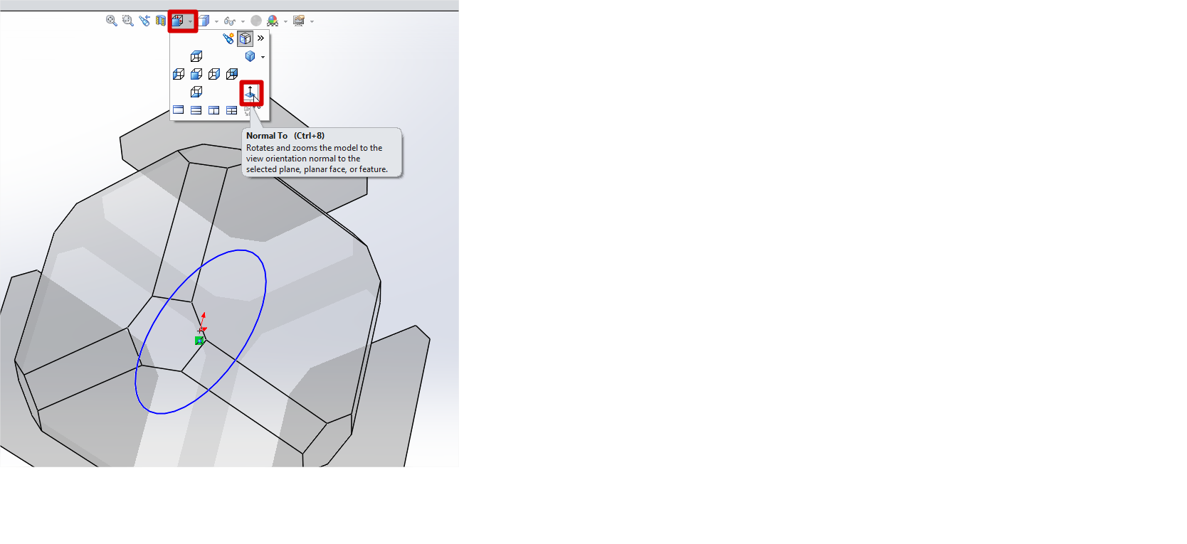 V SOLIDWORKS-u seveda obstaja nastavitev, ki nam obrne pogled normalno glede na skicino ravnino. Do te nastavitve pridemo tako, da izberemo gumb "View Orientation" nad delovno površino in izberemo gumb "Normal to". Privzeta bližnjica do tega ukaza je "CTRL+8".