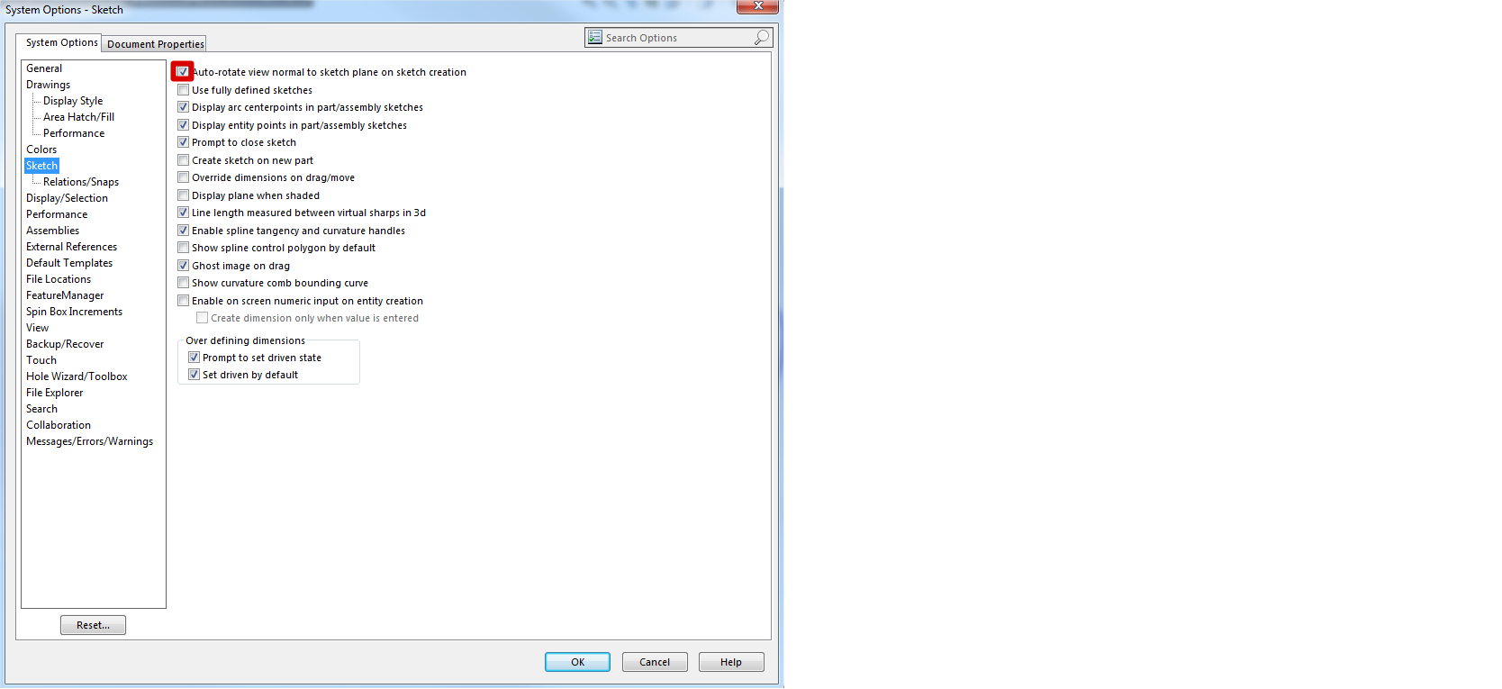 Če želimo, da se nam pogled vedno postavi normalno na skico, ko le-to naredimo, lahko to nastavitev vključimo v nastavitvah pod "Tools" -> "Options" -> "System Options" -> "Sketch" -> "Auto-rotate view normal to sketch plane on sketch creation".