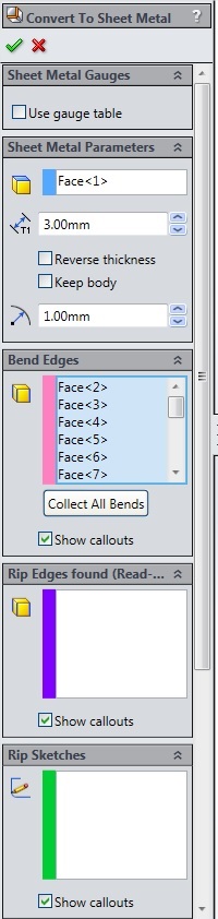 To se da narediti s funkcijo Convert to Sheet Metal. Pri tej funkciji najprej izberimo debelino pločevine, osnovno ploskev in kliknemo na Collect All Bends. S to funkcijo se kos spremeni v pločevino, ki jo lahko naprej obdelujemo z vsemi ostalimi funkcijami za obdelavo pločevine.
