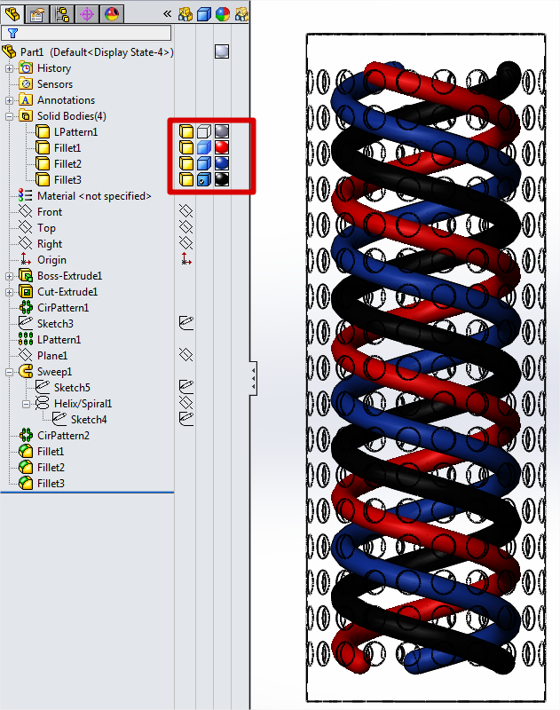 Različna telesa v kosu lahko predstavimo z različnimi načini (Display style). Razlilčne poglede lahko shranjujemo v Display State poglede. Display State shrani nastavitve pogledov (nekatera telesa so skrita, prosojna, prikazana na različne načine,…) in tako omogoča hitro preklapljanje med različnimi pogledi. Nov Display state se naredi na zavihku za konfiguracije z desnim klikom na prazen prostor v Configuration Manager-ju in z izbiro »Add Display State«.