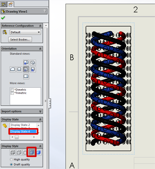Če želimo imeti takšen pogled v risbi, postavimo pogled na risbo, izberemo prirejeni Display State in za Display Style izberemo Shaded With Edges.