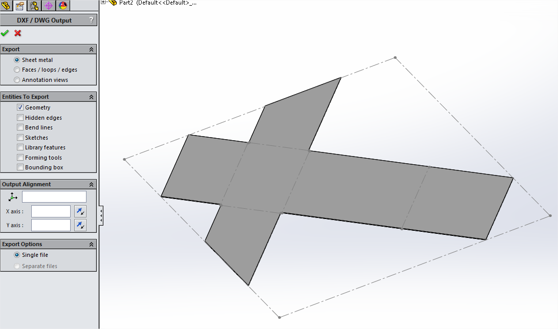 Shranimo DWG ali DXF razvite pločevine. Potrebno je še določiti izhodne parametre.