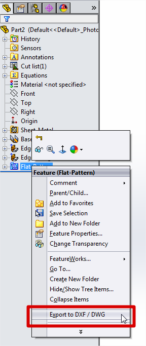 Z desnim klikom v drevesni strukturi izberemo "Flat-Pattern" in izberemo "Export to DXF/DWG".