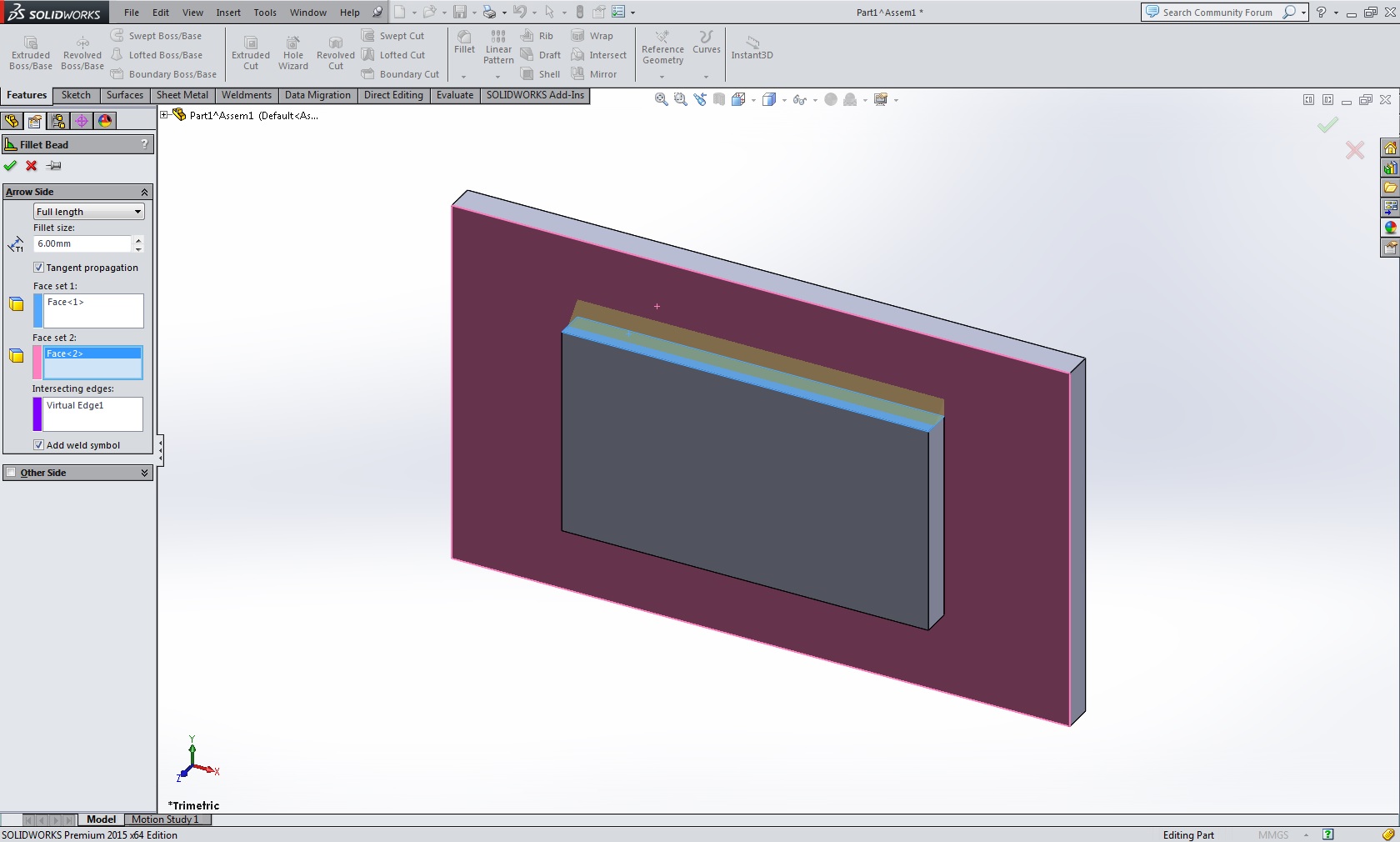- Na novem kosu sedaj imamo dve telesi na istih pozicijah kot kose v sestavu. Da dodamo zvar sedaj lahko uporabimo funkcijo Fillet Bead (Insert -> Weldments -> Fillet Bead).
