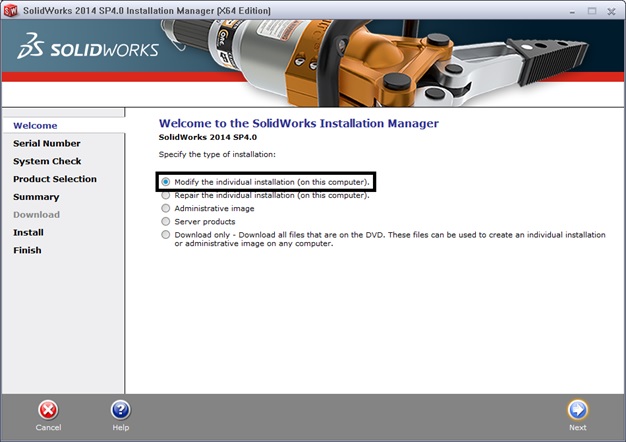 - Pokaže nam se prozor SolidWorks 2014 SPx.x Instalation Manager i odaberemo opciju »Modify the individual installation (on this computer)« i klinemo »Next«