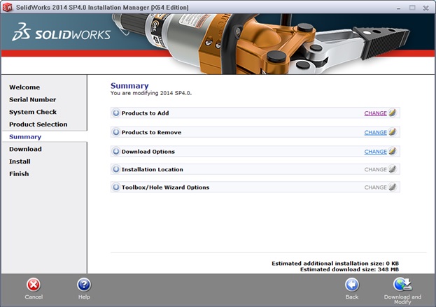 - U prozoru Summary kliknemo »Next« odnosno »Download and Modify« i pokrenemo postupak modifikacije SolidWorks-a i sačekamo da se postupak zaključi.