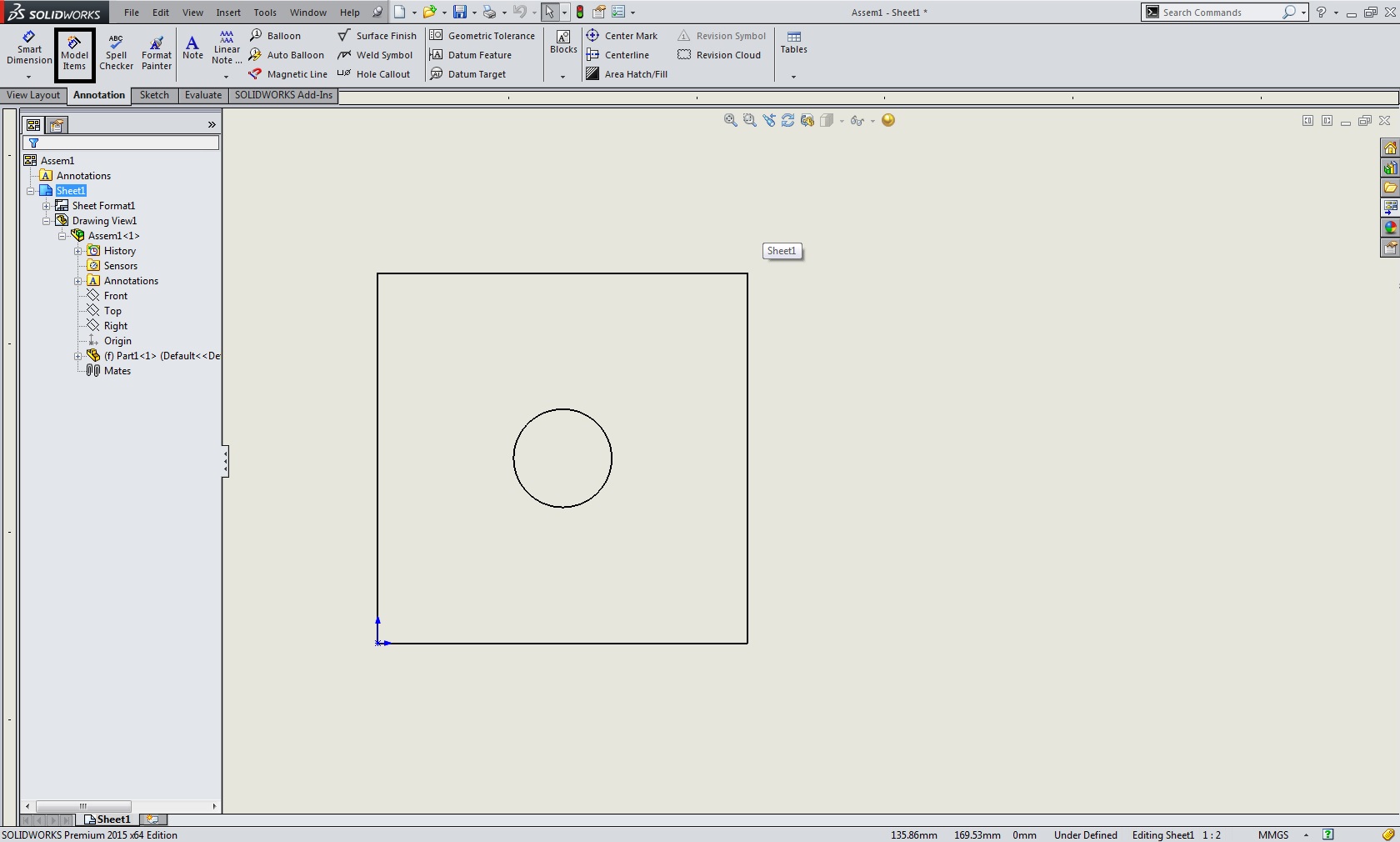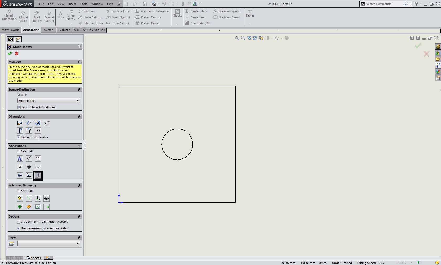 - Pod zavihek Annotation izberemo Model Items - V Model Items oknu za Source lahko izberemo ali želimo navoje prkazati na vseh pogledih na risbi ali samo na izbranimi pogledi. Glede nato da želimo z omenjeno funkcijo uvoziti samo navoj iz 3D modela oziroma sestava pod Dimensions izključimo vse opcije pod Annotation pa vključimo opcijo Cosmentic Thread. Potrdimo funkcijo Model Items in s tem so dodani navoji na pogledih sestava na risbi.