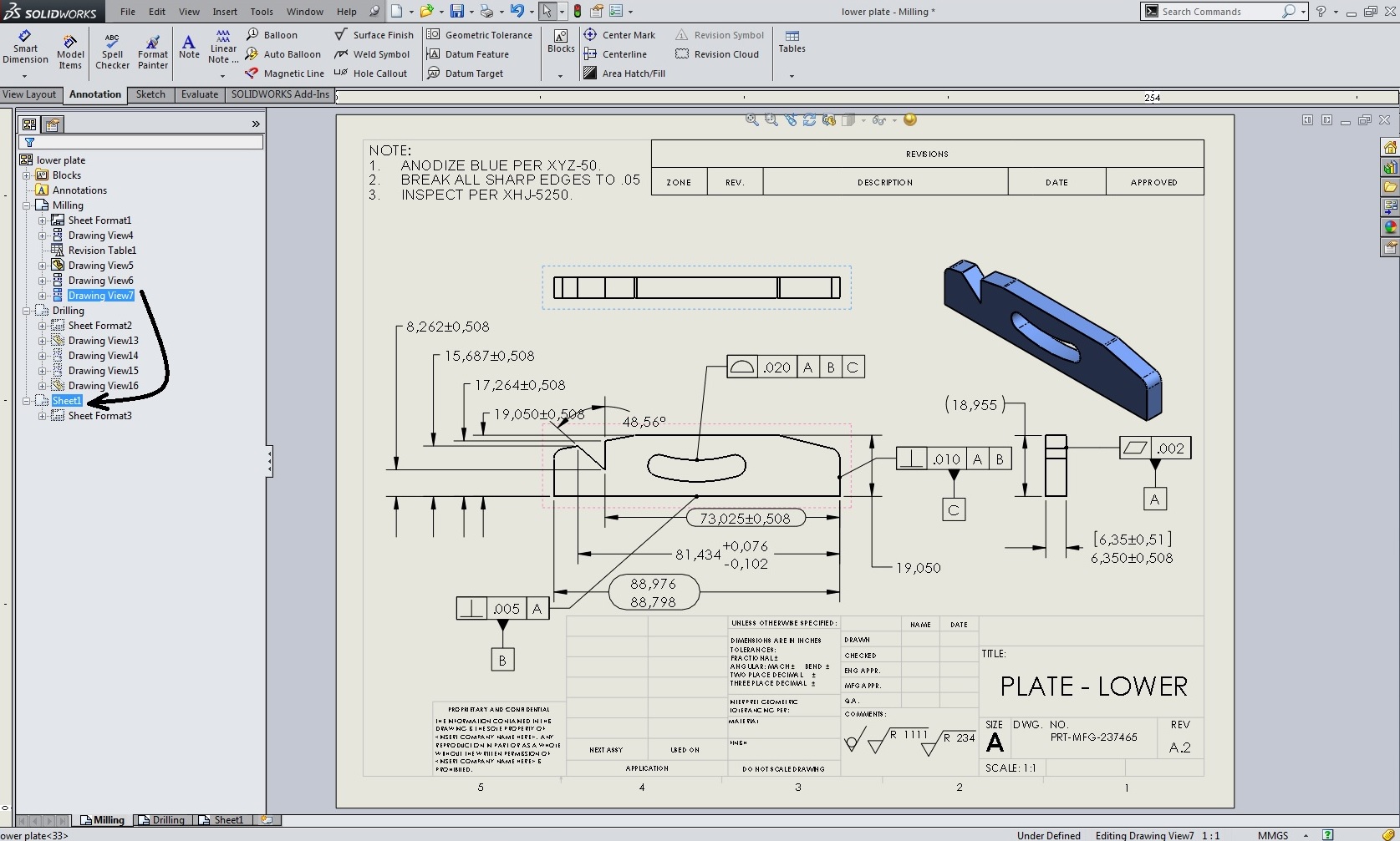 - Aktiviramo zavihek na katerem se nahaja pogled na katerega želimo kopirati na novi zavihek. Naprimer kopiramo pogled Drawing View 7, ki se nahaja na zavihku Milling na novi zavihek Sheet1 - V drevesni strukturi izberemo Drawing View 7 in držimo tipko Control (Ctrl) ter z miško primemo pogled in ga premaknemo na zvihek Sheet1 v drevesni strukturi, ter spustimo. - V zavihku Sheet1 se nam doda novi pogled v tem primeru Drawing View 18. - Aktiviramo zavihek Sheet1 in vidimo da imamo novo kopijo pogleda Drawing View 7 in tudi na isti poziciji kot je bil na zavihku Milling. Kopiramo lahko samo standardne poglede med tem ko prereze in detaljne poglede ni možno.