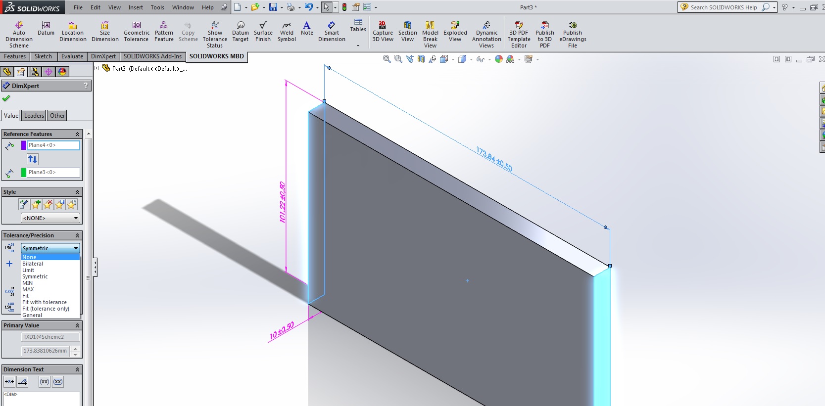 Da skrijemo tolerence dimenzij katere so dodane s pomočjo Dimxpert-a, lahko izberemo koto kateri želimo skriti toleranco in pod Tolerance/Precision izberemo None.